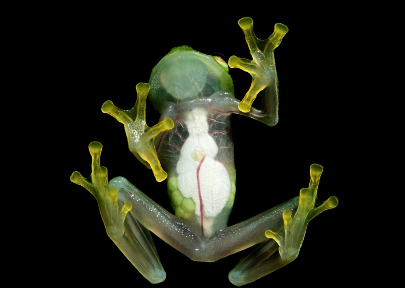 You can also see the internal organs of “glassy” frogs. This partial transparency helps concealment by enabling the transparent frog limbs to grasp the leaves of plants without any distinct separation between the frogs and the green parts. The abdomen of transparent frog helps to control the degree of brightness to suit the levels of light that vary from one place to another.