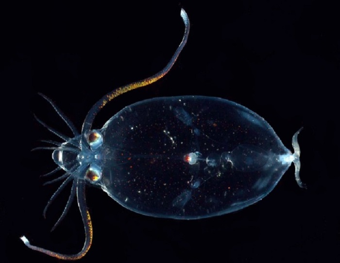 The cranchiidae squid is a completely transparent organism except in two locations: its eyes and its stomach.
