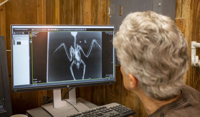 Lynn Tompkins, director of Blue Mountain Wildlife, looks over an x-ray of an injured Swainson’s hawk Tuesday, July 6, 2021. |