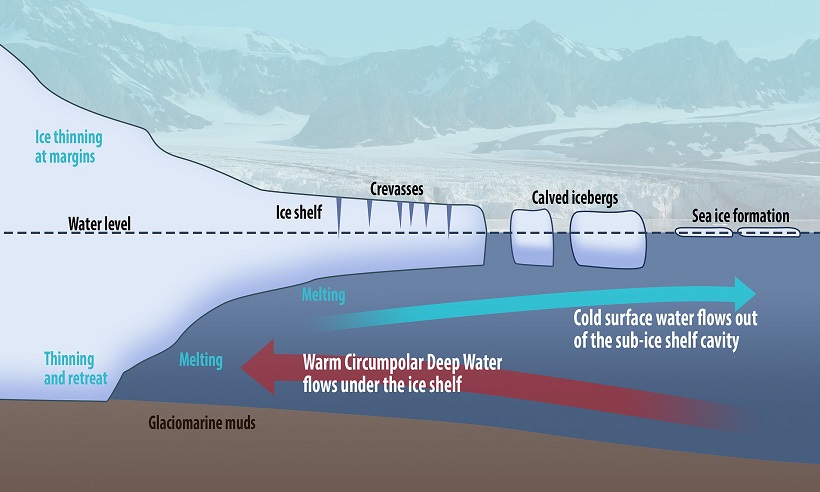However, the rate of ice loss in glaciers has accelerated remarkably in the past three decades, due in part to the hidden rivers of relatively warm seawater that cut through the bottom of the glacier, as well as the effects of accelerating climate change that has warmed the air and ocean.